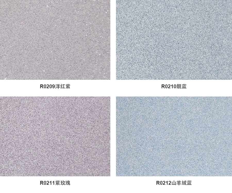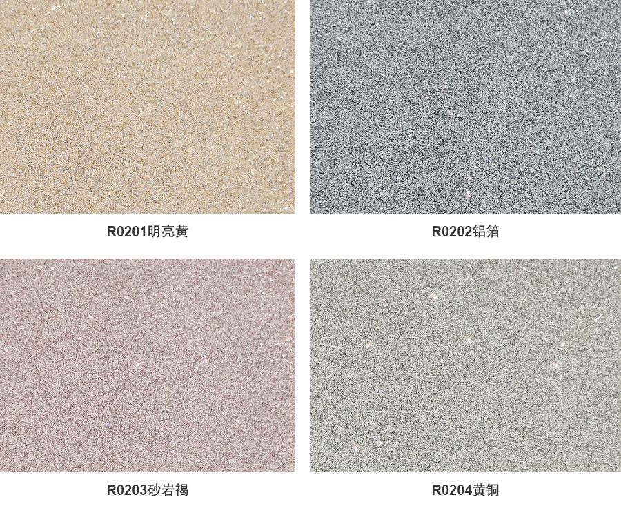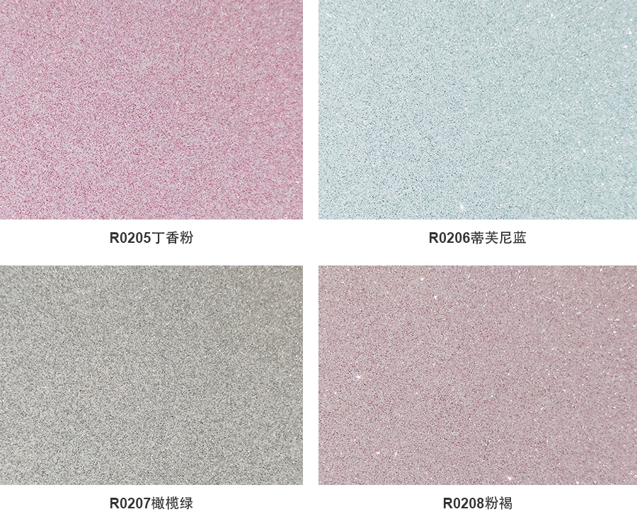 R02艺术涂料系列是一组以近年来家居装修流行的色系为基础开发的产品。这是一组不饱和而且通过增加互补色的灰度来降低互补配色的视觉冲击力,莫兰迪色系营造一种舒缓、宁静具有亲和力的家居效果。其中比较浓烈的有今年流行色:明亮黄、铝箔、砂岩褐、还有靓蓝,也有特别适合儿童房装修的丁香粉、粉褐、紫玫瑰、山羊绒蓝、蒂芙尼蓝,还有比较知性的有橄榄绿、黄铜、洋红紫。