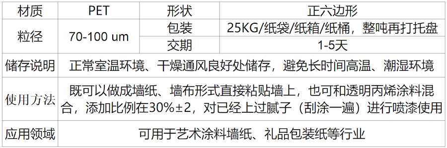 该组产品既可以做成墙纸、墙布形式直接粘贴墙上,也可和透明丙烯涂料混合,添加比例在30%±2,对已经上过腻子(刮涂一遍)进行喷漆使用,粒径大小在70um到100um之间。 可用于艺术涂料墙纸、礼品包装纸等行业